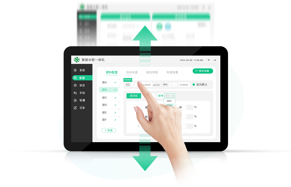 標配3肥1酸通道,模塊化設計,支持肥料通道、閥門數量任意擴展,靈活應用各種種植管理需求。